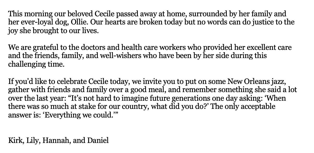 Rest in peace, my shero and friend Cecile Richards. To her friends and family, Kirk, Hannah, Daniel, Lily, and her chosen family, you’re all in my heart and prayers.